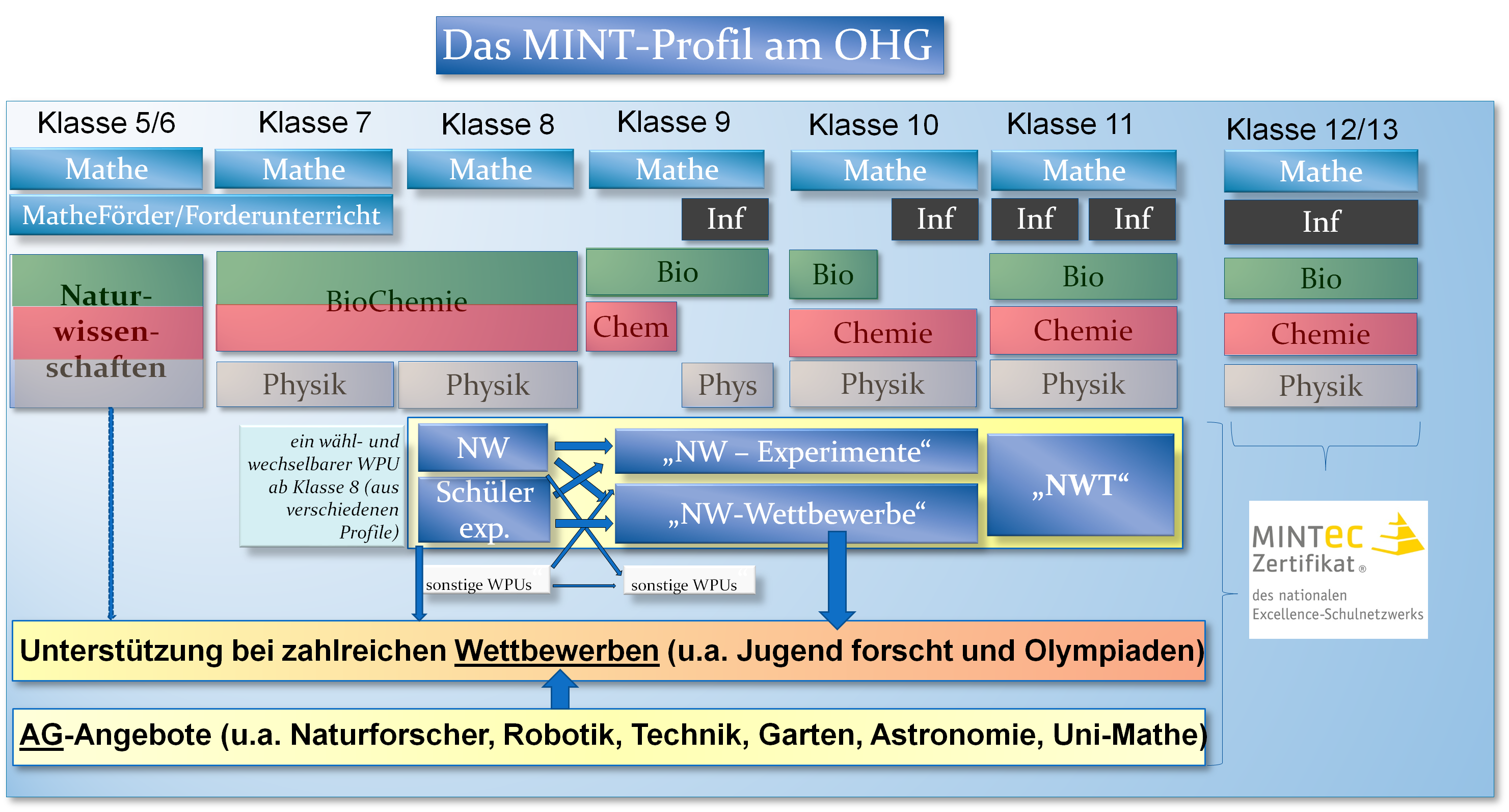 M = Mathematik I = Informatik N = Naturwissenschaften T = Technik Seit 2001 ist das OHG MINT-EC-Schule oder auch MINT-Excellence-Center. In das nationale Excellence-Netzwerk MINT-EC werden sog. Leuchtturmschulen mit einem hervorragendem mathematisch-naturwissenschaftlich-technischen Profil aufgenommen. Die anspruchsvolle Wiederzertifizierung erfolgt im Turnus von drei Jahren. |