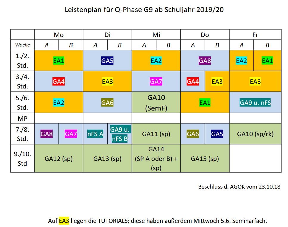 Das Seminarfach ist an das eA-Fach (1. bis 3. Prüfungsfach) eines jeden Schülers gebunden, das auf der Zeitleiste "EA 3" liegt. Die Seminarfachlehrerin/der Seminarfachlehrer ist automatisch Tutor/in der Schülerin bzw. des Schülers.