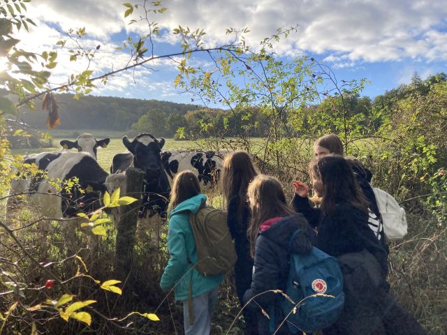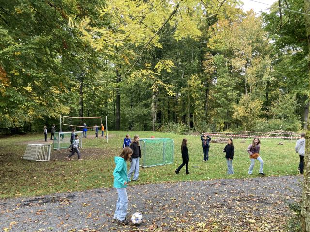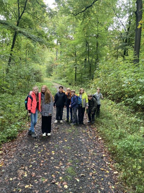 Wir haben uns am Donnerstag, dem 09.10.2025, am Bahnhof getroffen und sind dann gemeinsam mit dem Bus nach Dransfeld gefahren. Der sehr freundliche Hausmeister hat dort unsere Koffer abgeholt. Mit leichtem Gepäck und guter Stimmung sind wir zum Hohen Hagen gewandert. Es gab einen Spielplatz mit Seilbahn, Klettergerüst, Fußball-, Volley- und Basketballplatz, drum herum war Wald.