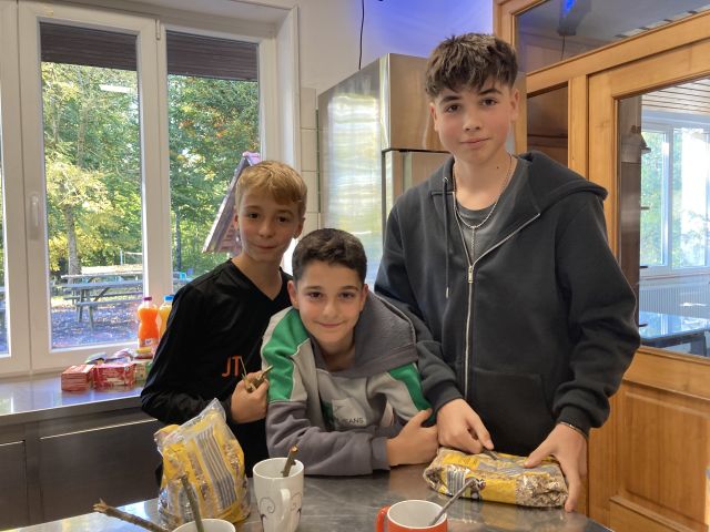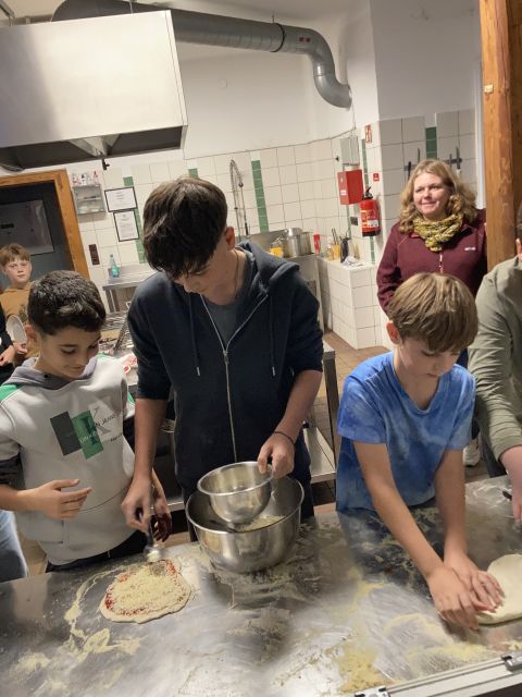 Erst ging es ins Haus: Wir zogen die Schuhe aus und legten das Gepäck ab. Als wir das Esszimmer betraten, standen schon Getränke bereit. Während wir tranken, wurden wir in die Regeln eingewiesen, dann bekamen wir eine Führung durchs Haus. Wir bezogen unsere Achtbettzimmer und spielten Tischtennis oder Kicker, malten oder beschäftigten uns anderweitig. Unsere Lehrerinnen, Frau Stehr und Frau Pabst, kümmerten sich derweil um einen Plan, wer wann mit wem wofür zuständig sein sollte. Zum Mittagessen gab es Nudeln, zum Abendessen gab es Pizza, die in einem Pizzaofen gebacken wurde und welche jeder mit einem Partner zusammen plätten und belegen musste. Zum Frühstück gab es dann Brötchen mit mitgebrachten Aufstrichen. Aus dem Abwaschen mit Helga, der Spülmaschine, wurde ein fröhliches Beisammensein.