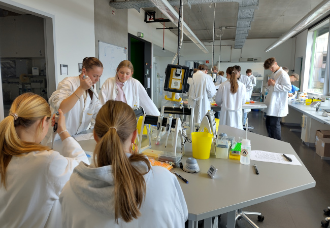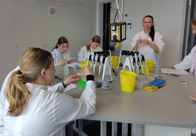 (krj.) Noch vor den Sommerferien besuchten die Schülerinnen und Schüler des eA-Biologie von Frau Dr. Kraus das XLAB. Hier konnten die bislang erworbenen Kenntnisse zu verschiedenen Methoden der Molekulargenetik angewendet werden. Wie pipettiert man Volumina von 10 µl? Wie wenig ist das überhaupt? Man sieht das ja (fast) gar nicht! Wie sieht ein Thermocycler für eine PCR (Polymerasekettenreaktion) aus? Wie wabbelig oder fest ist eigentlich ein Agarosegel für eine Gelelektrophorese? Aber auch: Wie lange dauert das eigentlich, bis man Ergebnisse hat?