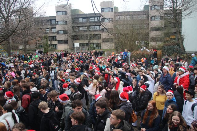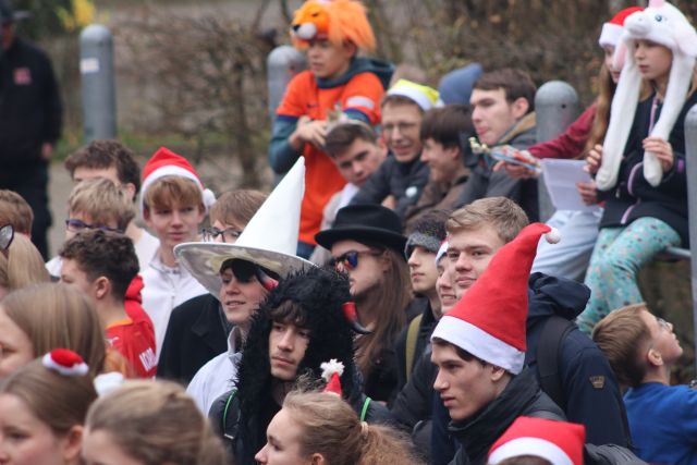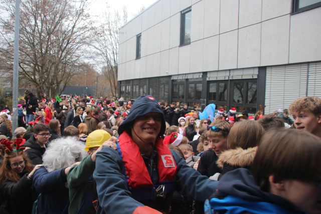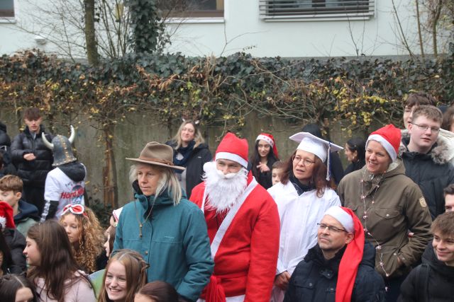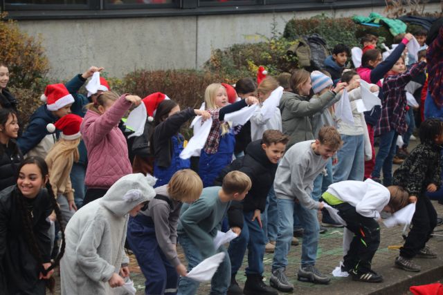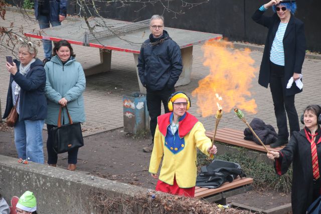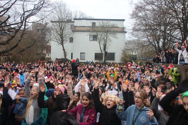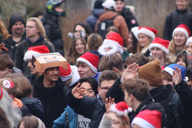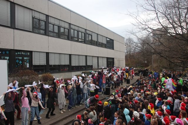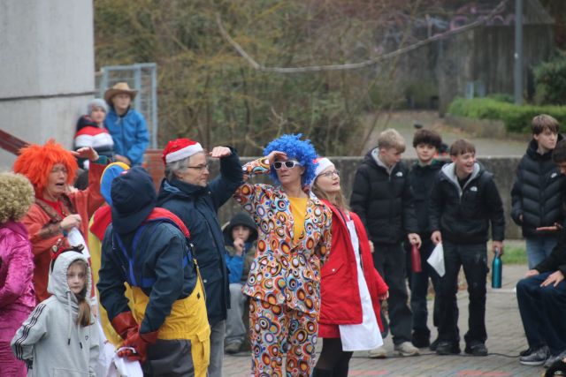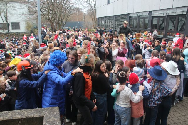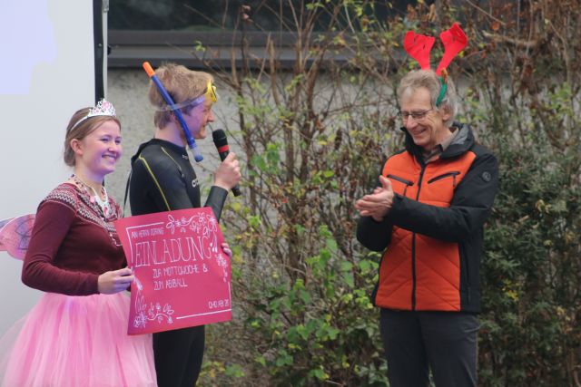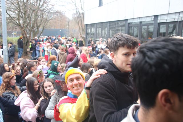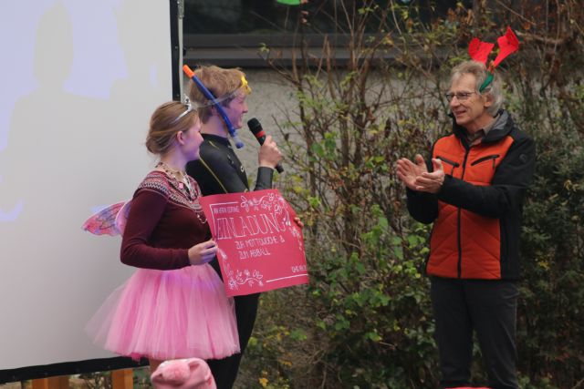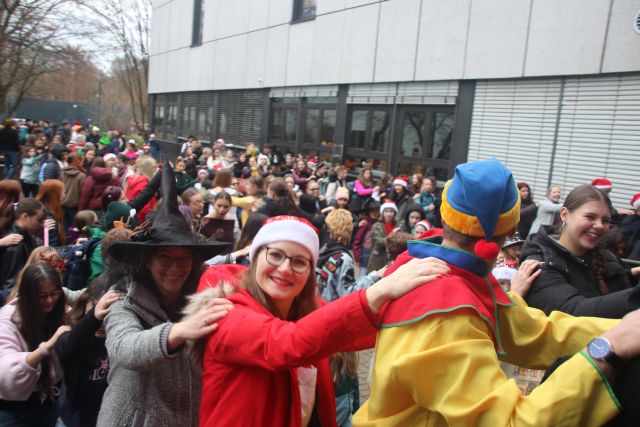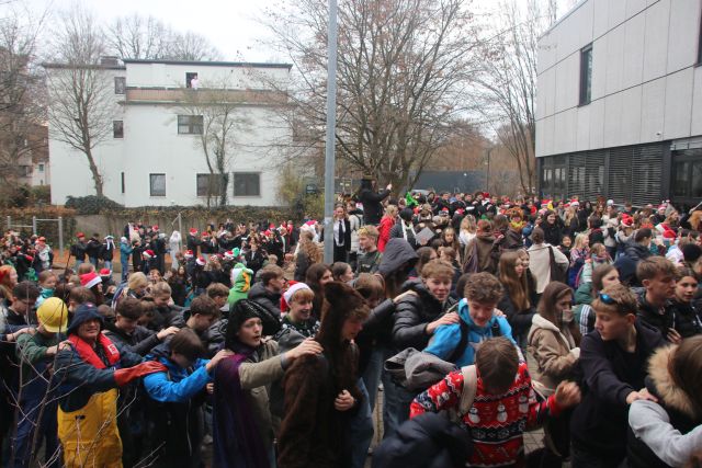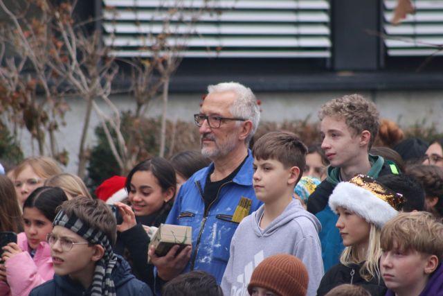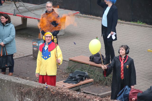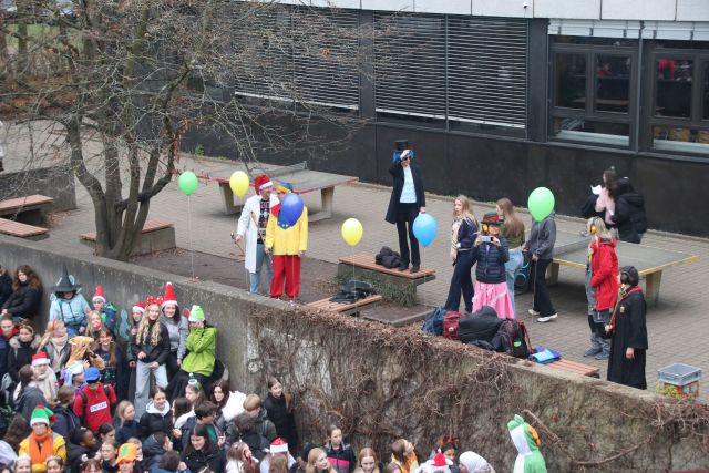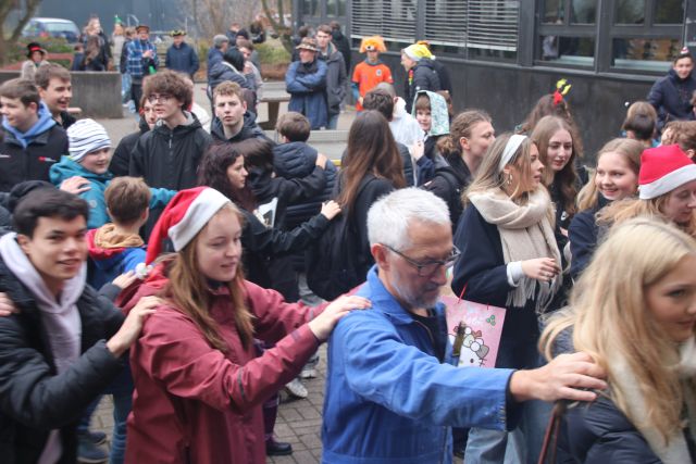Auf dem Südhof ging es dann rund: Nach dem Zünden von Wasserstoffballons und dem gemeinsamen Rufen "Friedhelm! Du bist der Beste!" ließen wir mit musikalischen und tänzerischen Darbietungen den Pausenhof beben. Die Hauptperson verteilte dabei seine vielen Aufgaben nun an andere Mitglieder der Schulgemeinschaft: Ob Kekse beim Abholen der Klassenbücher, Unterstützungszettel für die Abiturient*innen und natürlich die Spiele-Ausgabe - Friedhelm Döring stellte sicher, dass diese Jobs nun auch weiter geführt werden!