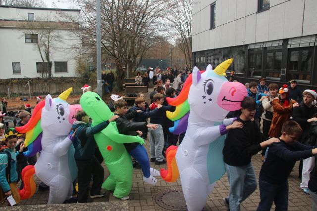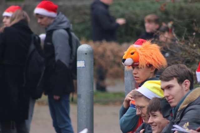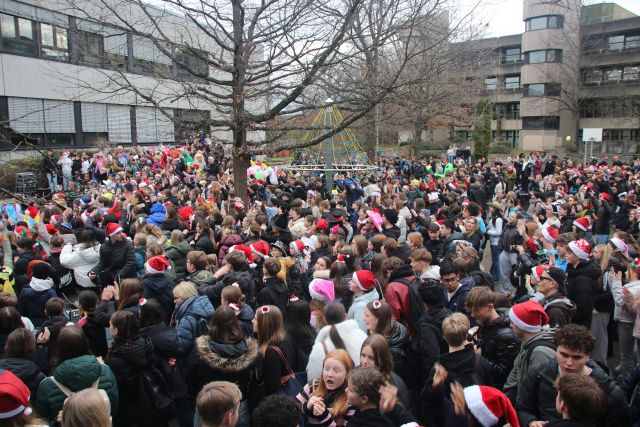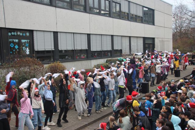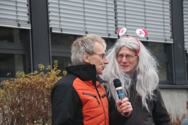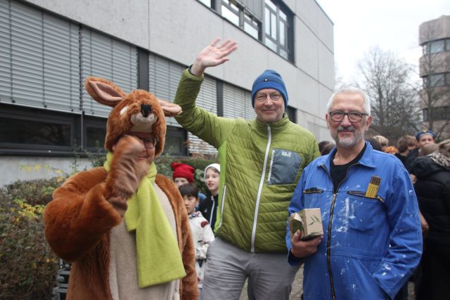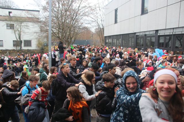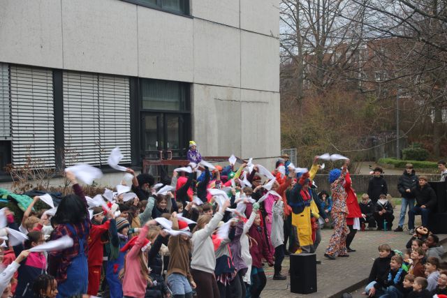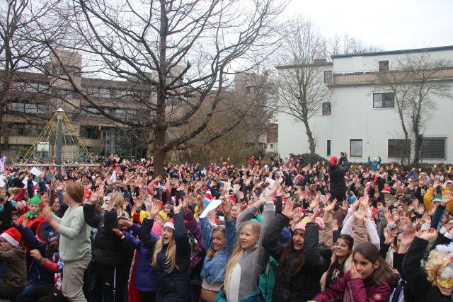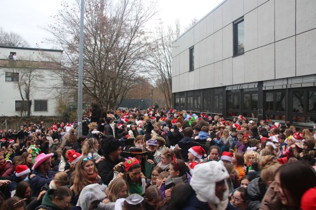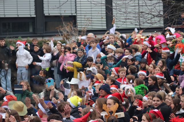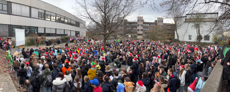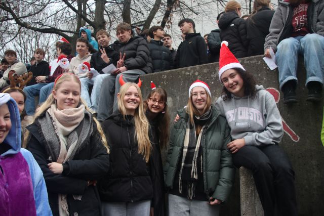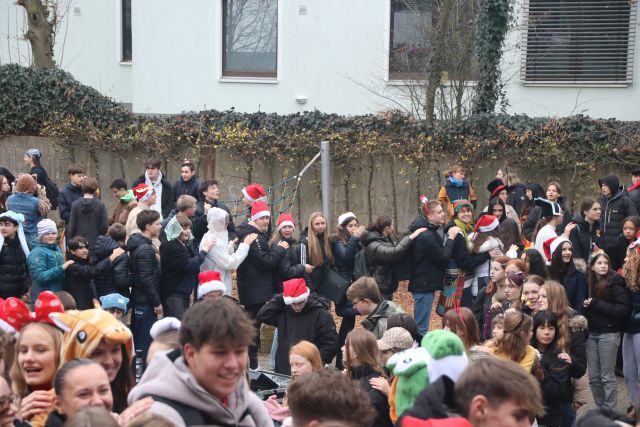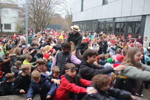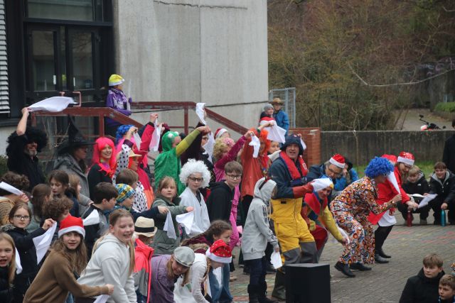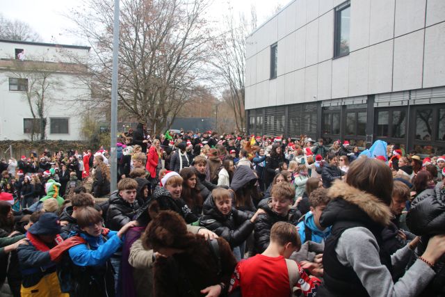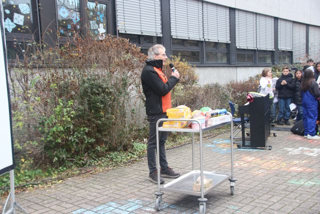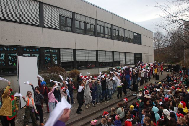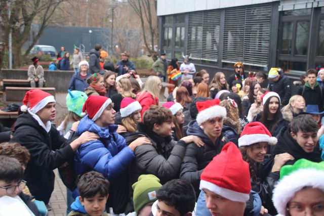 Auf dem Südhof ging es dann rund: Nach dem Zünden von Wasserstoffballons und dem gemeinsamen Rufen "Friedhelm! Du bist der Beste!" ließen wir mit musikalischen und tänzerischen Darbietungen den Pausenhof beben. Die Hauptperson verteilte dabei seine vielen Aufgaben nun an andere Mitglieder der Schulgemeinschaft: Ob Kekse beim Abholen der Klassenbücher, Unterstützungszettel für die Abiturient*innen und natürlich die Spiele-Ausgabe - Friedhelm Döring stellte sicher, dass diese Jobs nun auch weiter geführt werden!