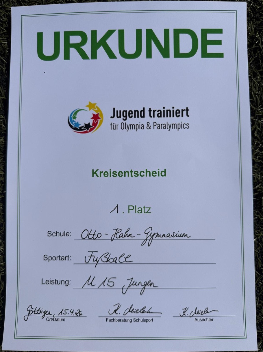 (pre.) Am Mittwoch, den 15.04.2026, nahm unser U15-Fußballteam (Jahrgänge 2012/2013) beim "Jugend trainiert für Olympia"-Kreisentscheid am Sandweg teil. Betreut wurde die Mannschaft, wie in den vergangenen zwei Jahren, von Herrn Preuninger und unserem ehemaligen Schüler Simon Ahlborn (Abiturjahrgang 2023).