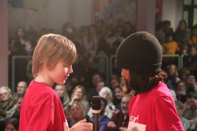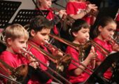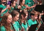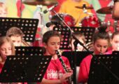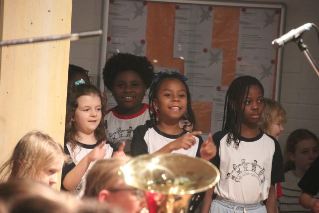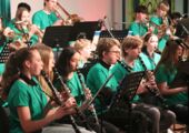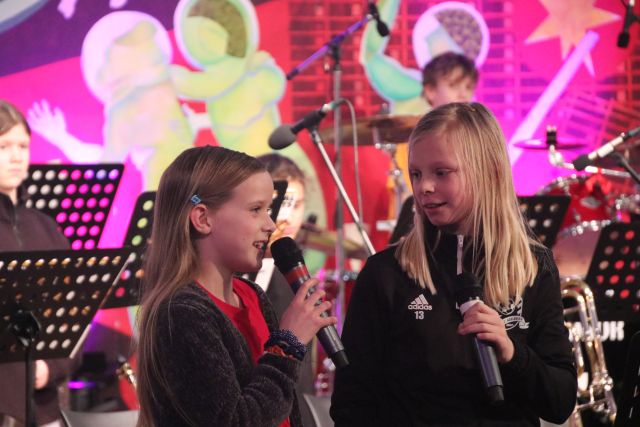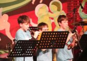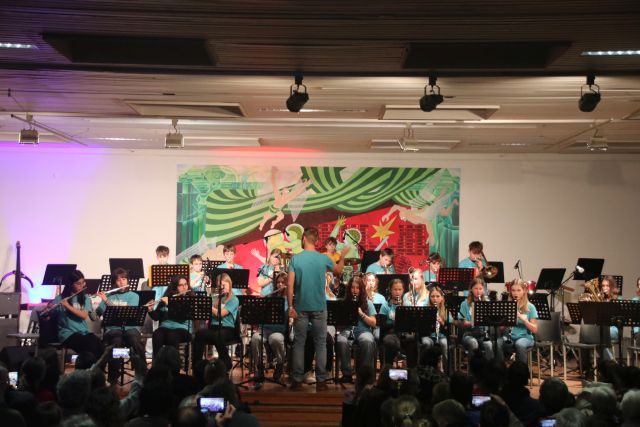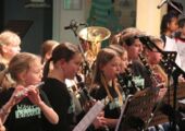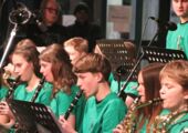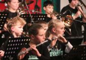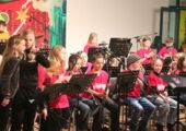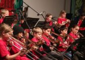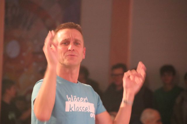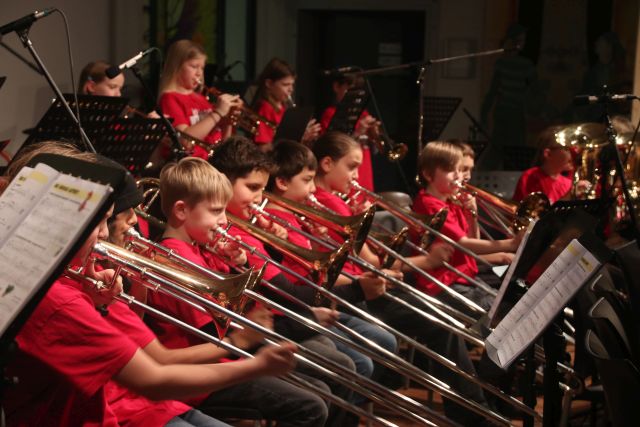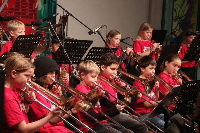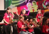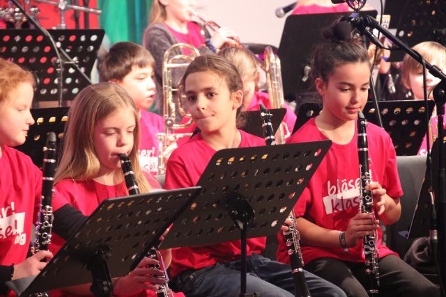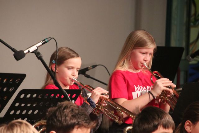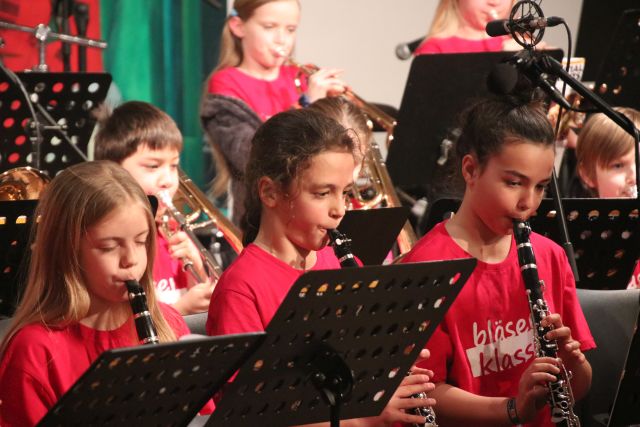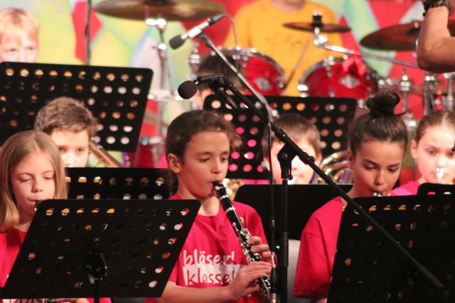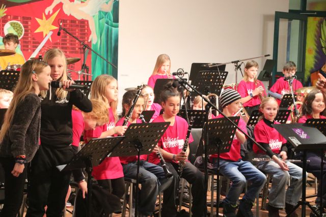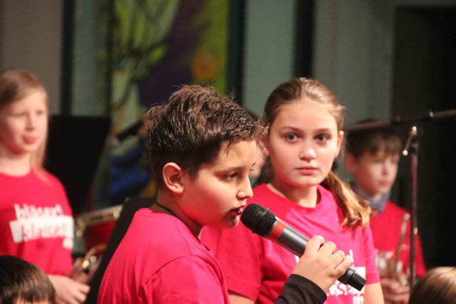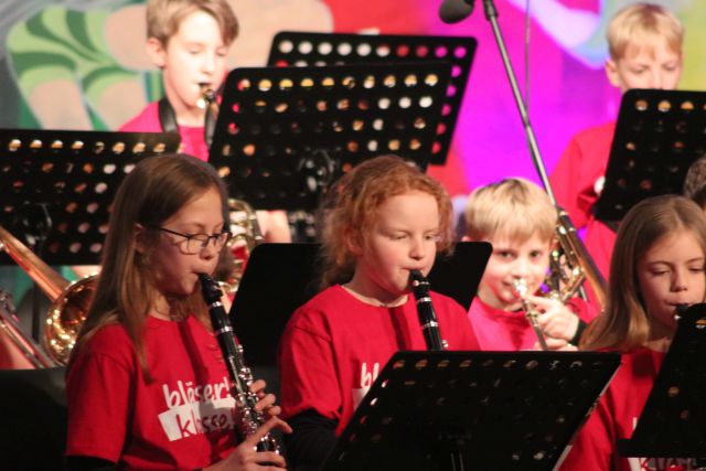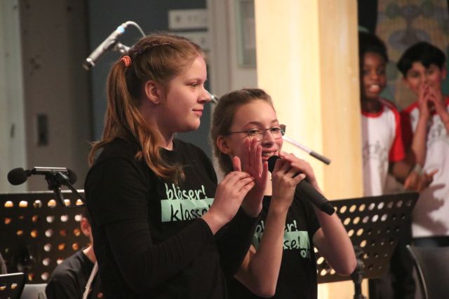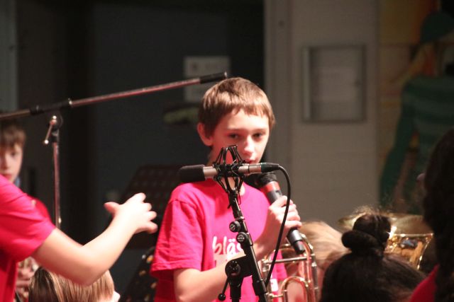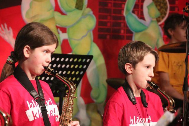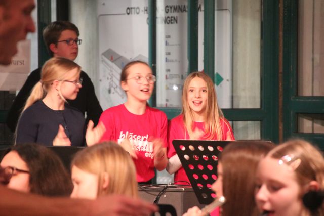 Spannend ist es in jedem Jahr auch, den Prozess innerhalb der verschiedenen Bläserklassen zu beobachten. So spielen die Kinder der fünften Klasse ihr Instrument gerade einmal drei Monate und können doch schon mit mehrstimmigen Stücken glänzen. Der Auftritt der aktuellen 5B war in diesem Jahr neben den musikalischen Darbietungen auch dem Aspekt der Show gewidmet. Die "Pink Panthers" traten zunächst maskiert auf und präsentierten erst dann ihre nagelneuen pinken Band-T-Shirts mit dem Aufdruck „bläser!klasse!“. Nach fünf kurzen Stücken erfolgte natürlich auch der Abgang unkonventionell: mit einem Bugs Bunny - Song („Das Publikum war heute wieder wundervoll“). Es war ein insgesamt gelungener Eintritt ins Showgeschäft!