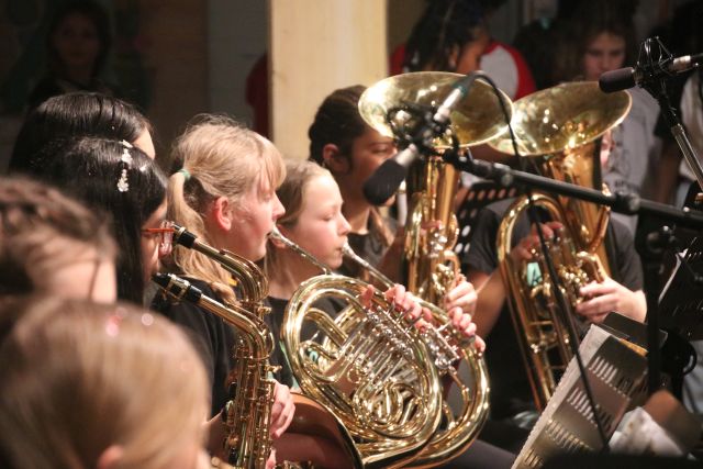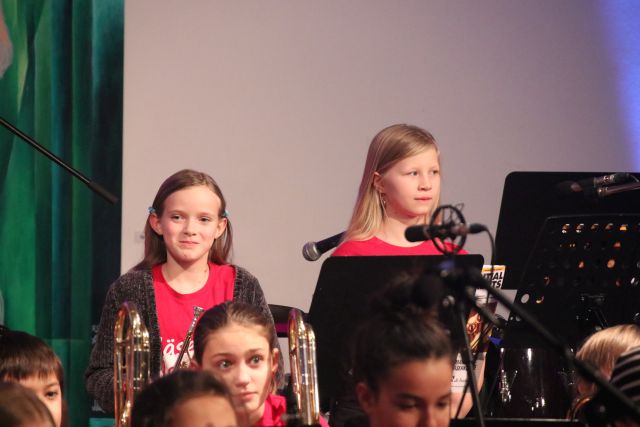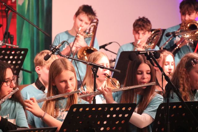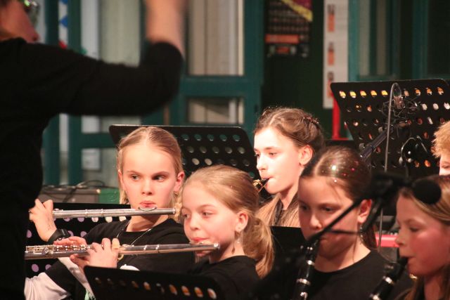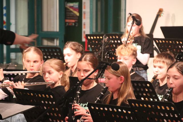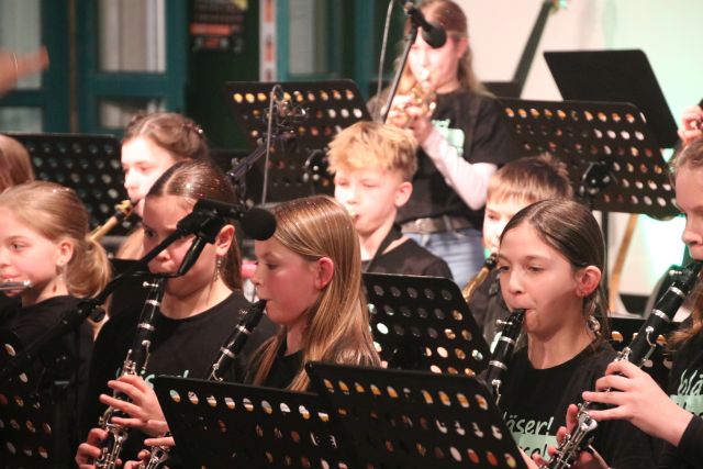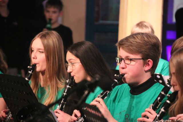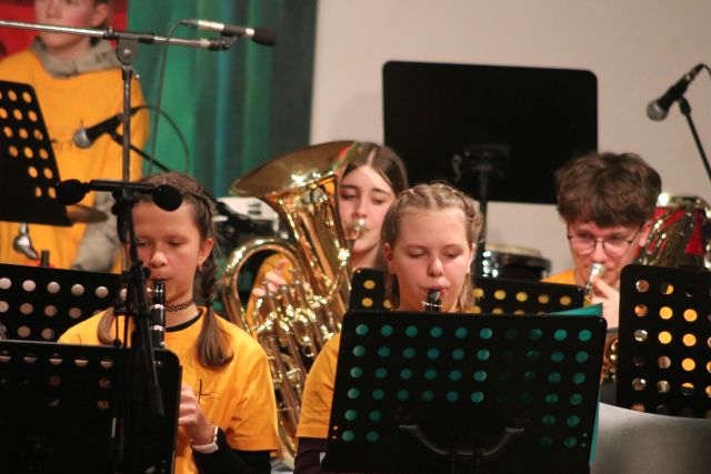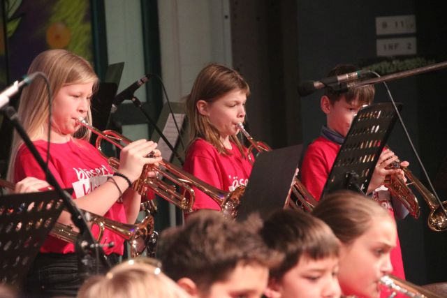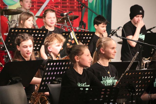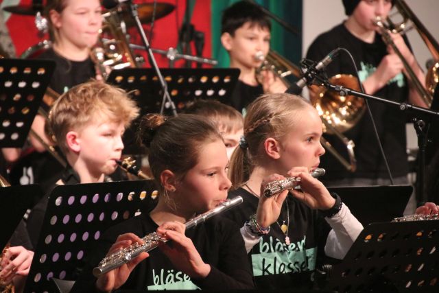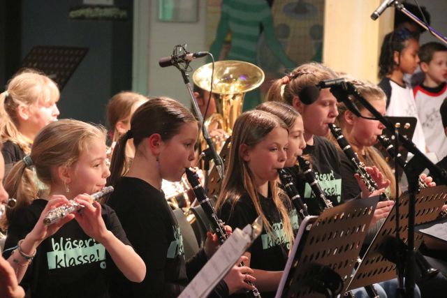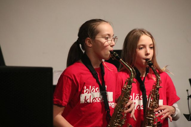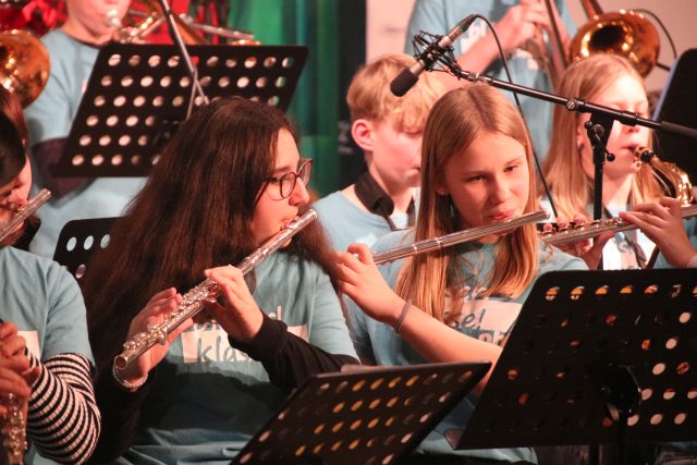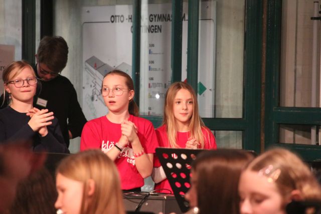 Welche Fortschritte in recht kurzer Zeit möglich sind, zeigte im Anschluss daran die Klasse 6B. Diese präsentierte unter der Leitung von Frau Lüdecke ein rundum überzeugendes Programm mit Stücken wie "Fluch der Karibik" und "Mary Poppins". Dabei zeigten sich die jungen Musiker und Musikerinnen sehr intonationssicher und meisterten auch technisch schwierige Stellen mit Leichtigkeit.