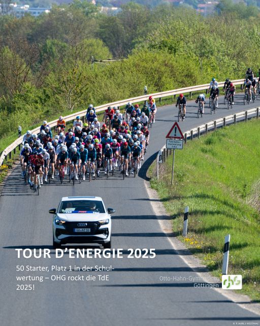 Jonas Hahn (10M) durfte sich im Ziel mit einer sensationellen Zeit von 1:12:50 über den zweiten Platz in der Jugend M - Wertung freuen, Herr Preuninger erreichte in seiner Altersklasse mit 1:06:37 ebenfalls den zweiten Platz. Insgesamt war die TdE 2025 wieder eine unglaublich tolle Veranstaltung bei bestem Wetter und perfekter Organisation. Vielen Dank an Johannes Frey von der GoeSF für dieses großartige Event. Wie begeistert die Teilnehmer/innen waren, zeigte sich auch in den strahlenden Gesichtern im Ziel und Sätzen wie diesem: "Nächstes Jahr sind wir wieder dabei - und jeder bringt jeweils noch zwei Neue mit." Dann sollte es eigentlich auch mit der Titelverteidigung klappen. Philipp Jahn, Jannis Westphal, Felix Hesse und Robin Büte haben so viele Fotos gemacht, dass es schade wäre, wenn das Homepage Team eine Auswahl treffen würde. Hier findet ihr alle Fotos: https://nextcloud.ohg-goe.net/s/JfBN22n3LTbdifE |