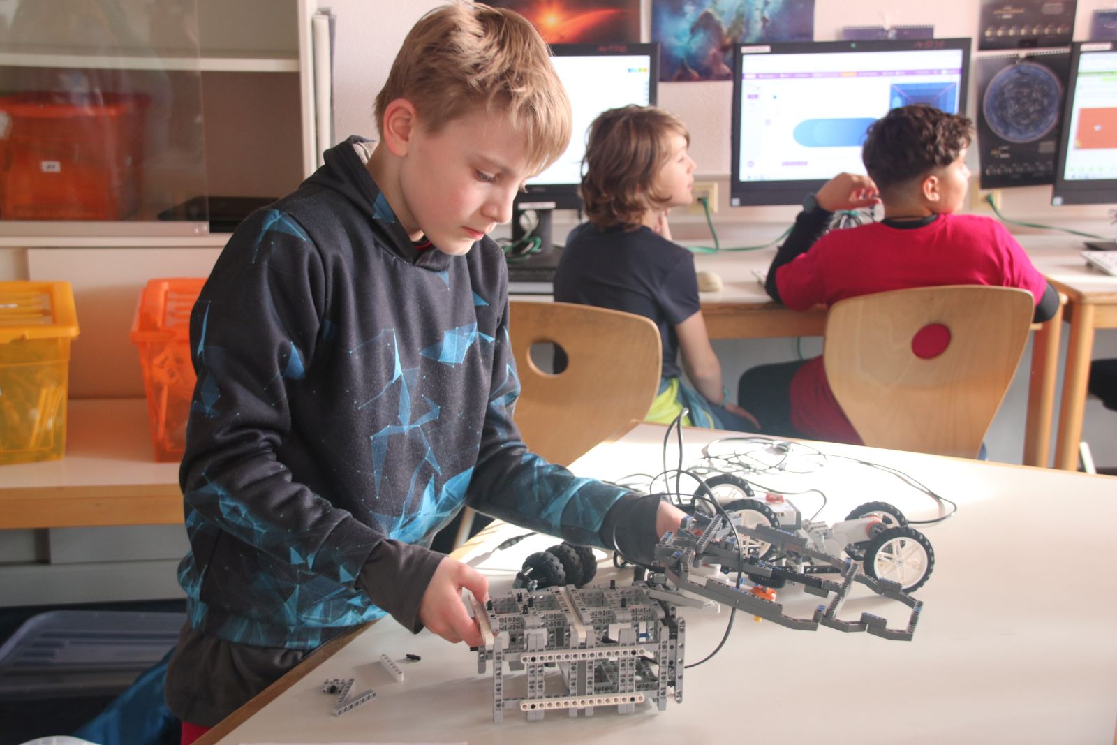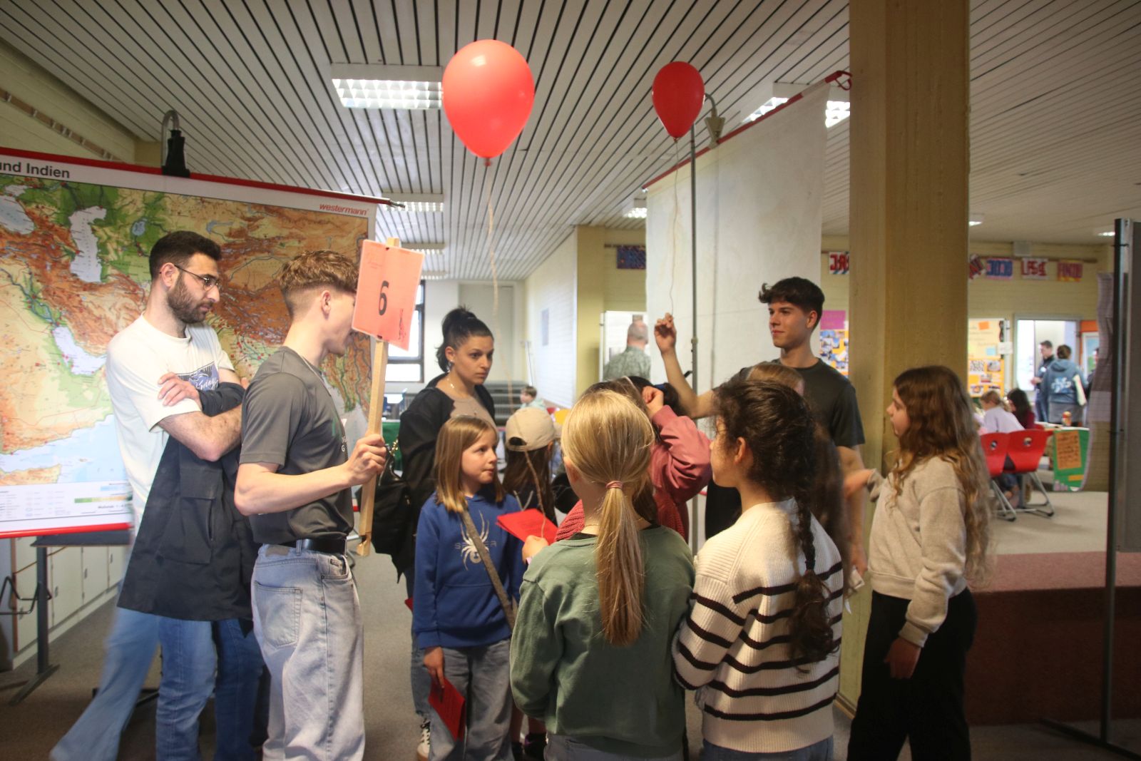 Bei der Auftaktveranstaltung in der S-Arena nahm Freddy seine Zuschauer:innen mit auf eine virtuelle Rundtour durch unsere Schule. Viel konkreter wurde es dann, als die Schüler und Schüler:innen der Jahrgänge 9 bis 12 ihren Kolleg:innen aus den Grundschulen die Schule "in echt" zeigten.